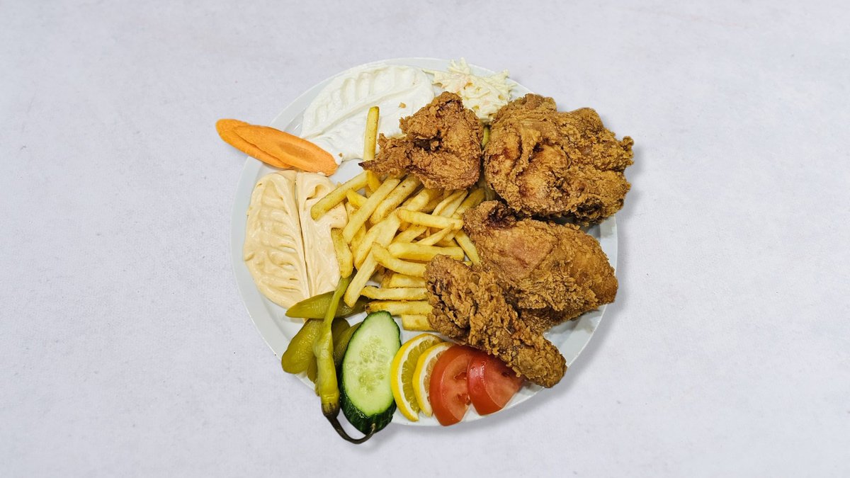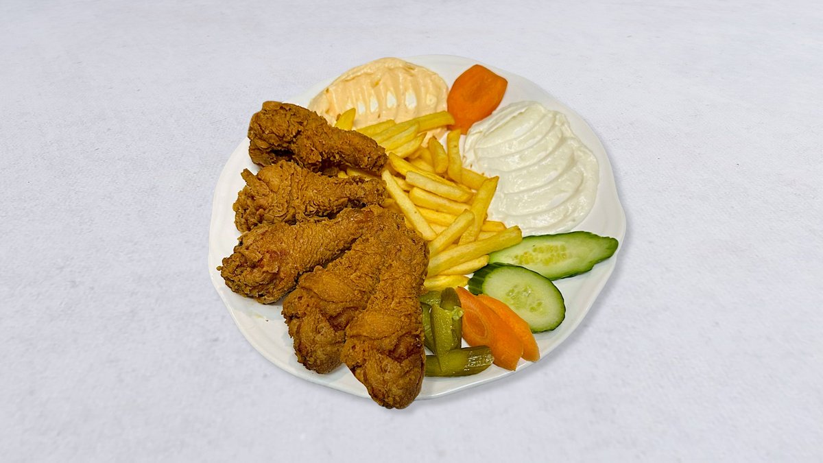 4 st friterad kycklingbitar, ris eller pommes frites, vitlökssås, stark sås, och saltgurka.