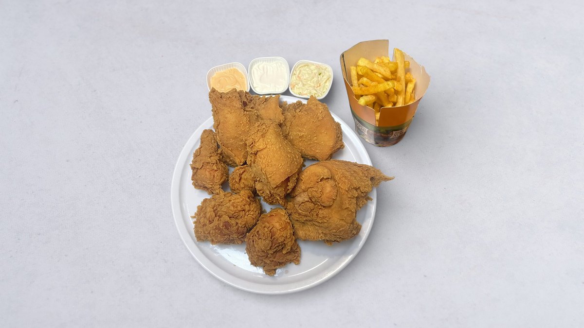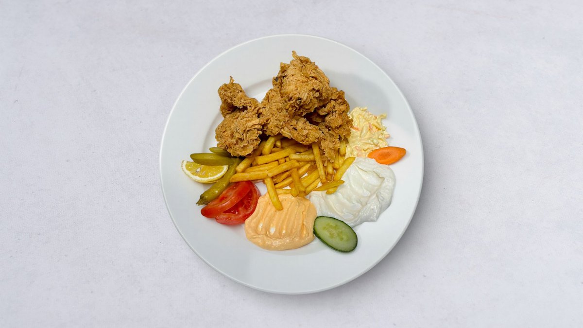 8 st friterad kycklingbitar, ris eller pommes frites, stark sås, vitlökssås och saltgurka.