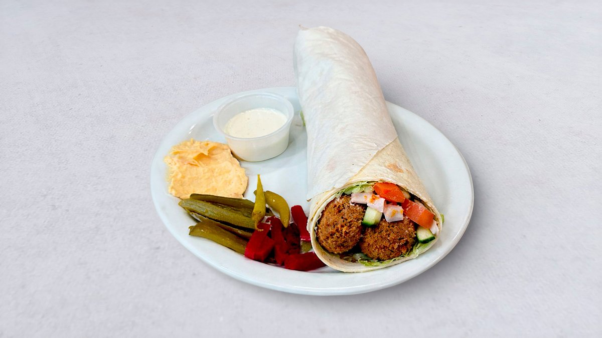 Krispig falafel, pitabröd, grönsaker (tomat, gurka, saltgurka, persilja) tahinisås och inlagd kålrot.
