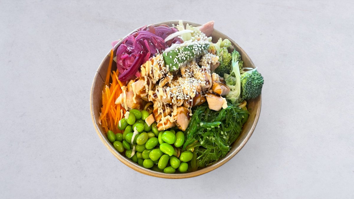 Grönsaker bönor, picklad lök och avokado. Toppad med chilimajo, teriyaki sås och sesam.