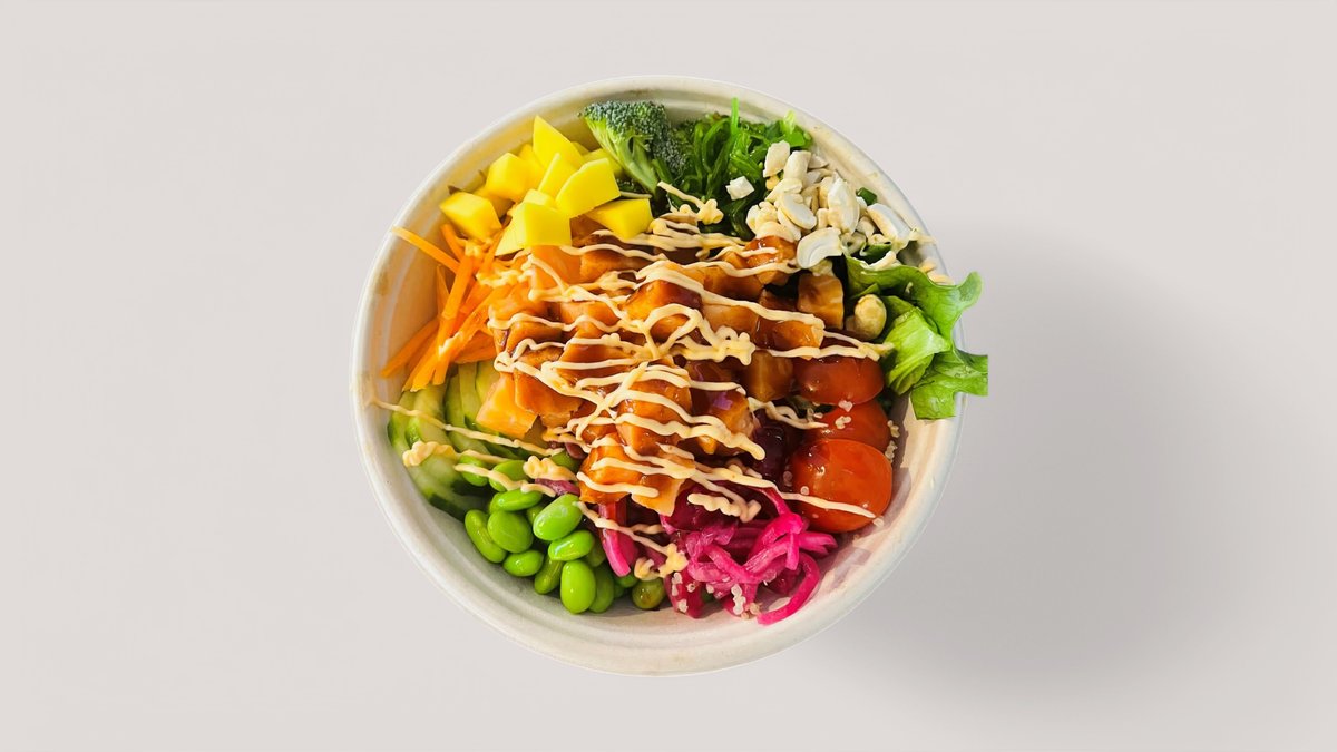 Röttris, lax, grönsaker, mango och sjögrässallad. Toppad med pokesås, chilimajo och cashewnötter.