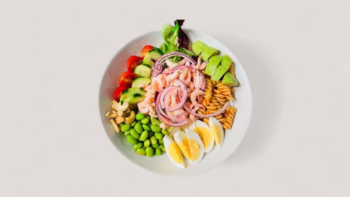 Handskalade räkor, rödlök, bönor, ägg, avokado och nötter.