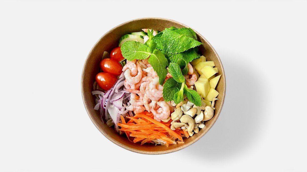 Handskalade räkor, rödlök, morötter,ruccola ,mango och cashewnötter.