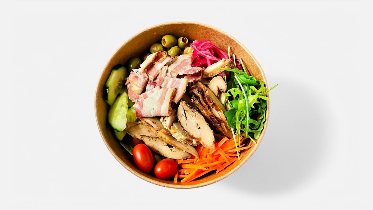 Bacon, grillad kyckling, oliver, picklad lök, morötter, ruccola och parmesan.