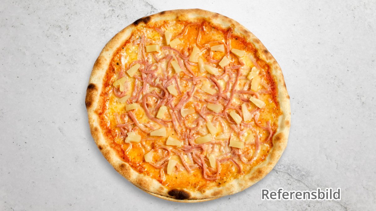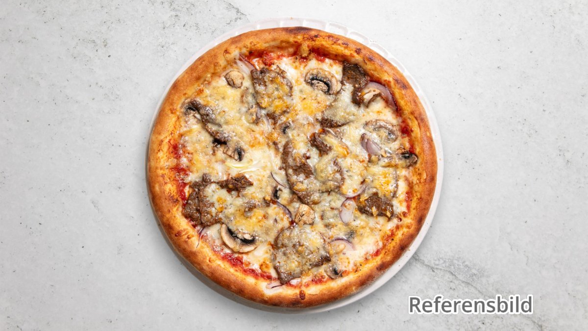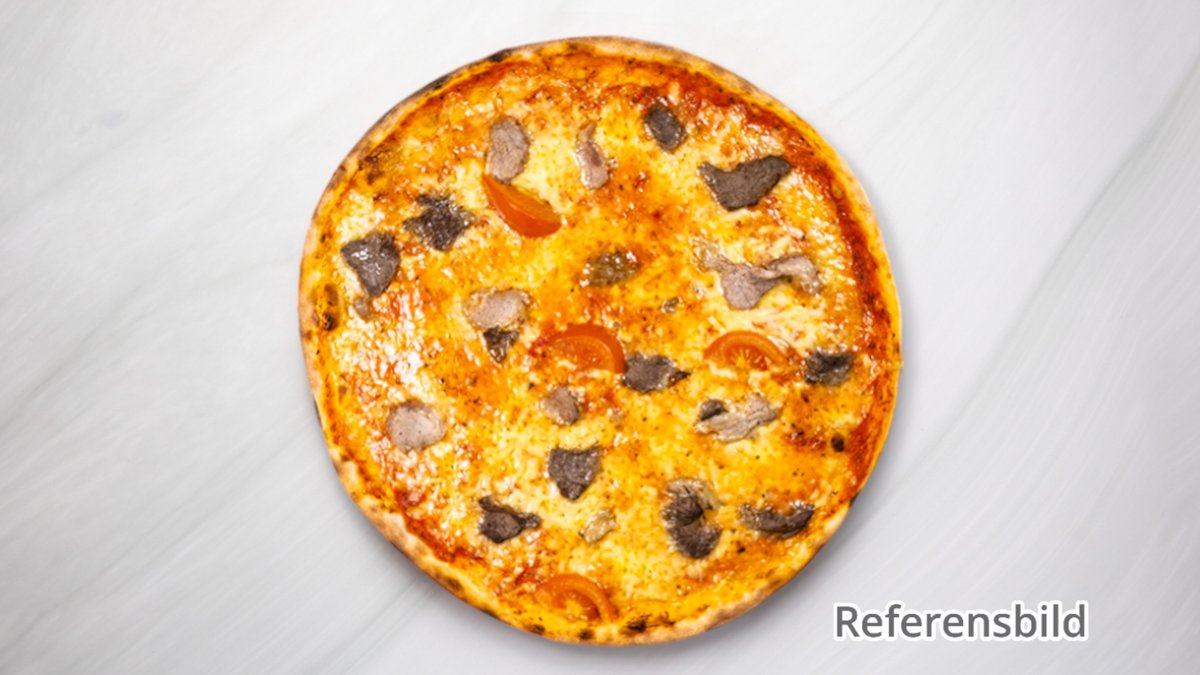Alla pizzor serveras med ost och tomatsås.