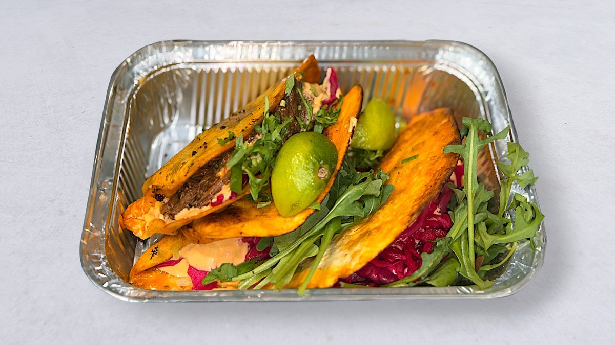 Serveras med långkokt högrev, vårlök, salsa, picklad rödkål, chilimajo och koriander.