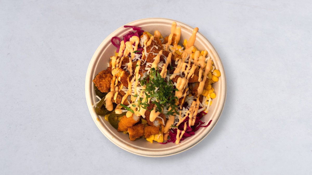 Serveras med nachochips, friterad tofu, salsa, picklad rödkål, rödlök, jalapeño, majs, ostsås, chilimajo och koriander.