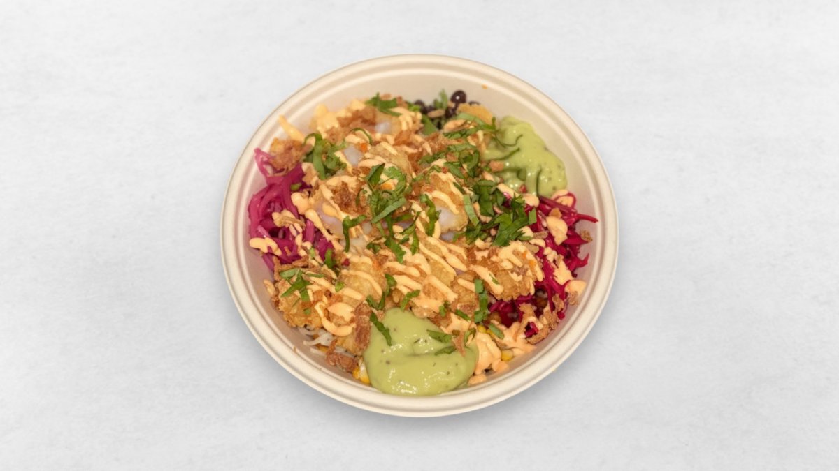 Krispig räkor som serveras med ris, svarta bönor, majs, salsa, picklad rödlök, rödkål, ost, guacamole, chilimajonnäs, rostad lök och koriander.