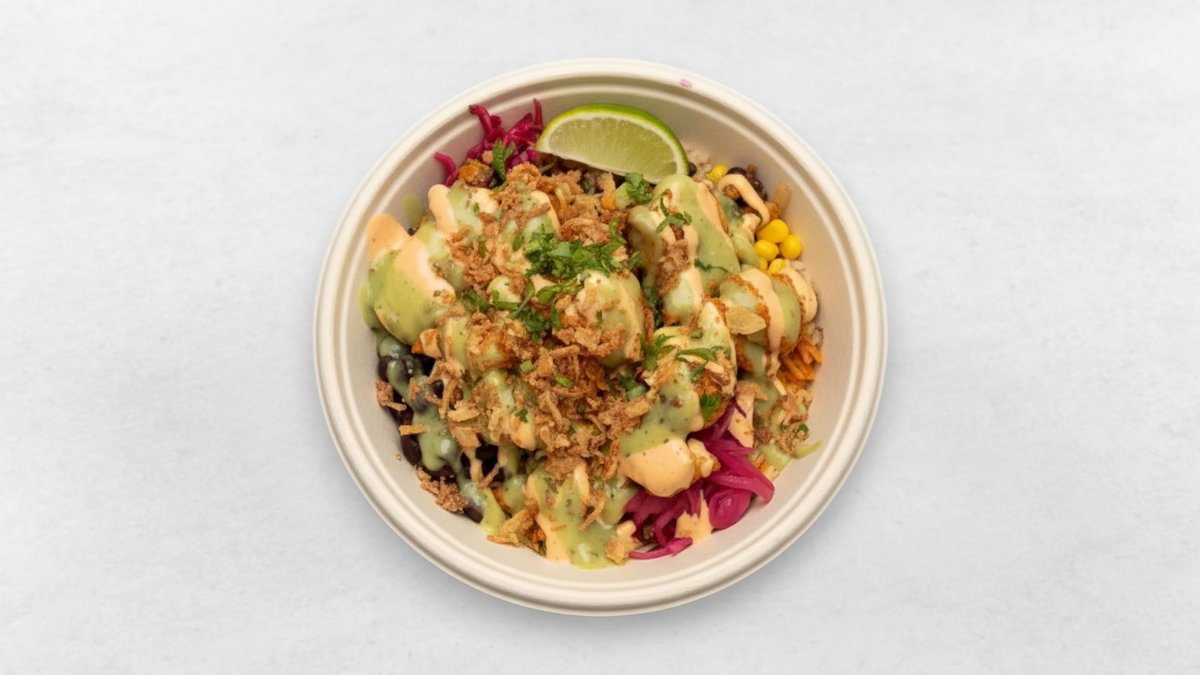 Serveras med friterad tofu, ris, ost, bönor, ruccola, picklad gurka, salsa, guacamole och chilimajo.
