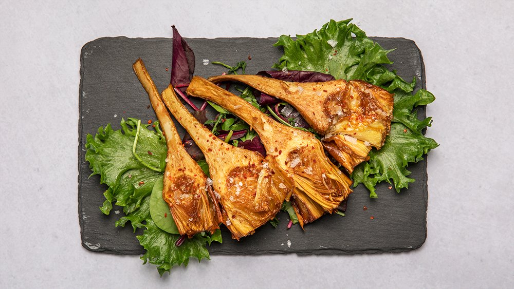 Krispiga kronärtskockshjärtan toppade med citron och vitlök.