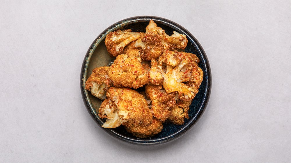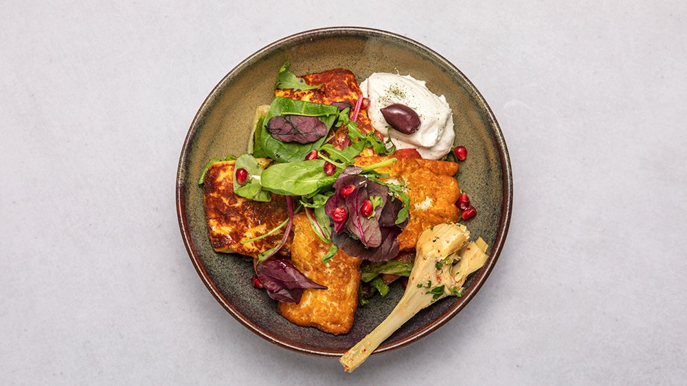 Spenatdumpling, falafel, ostrulle, blomkål och kronärtskockshjärta.