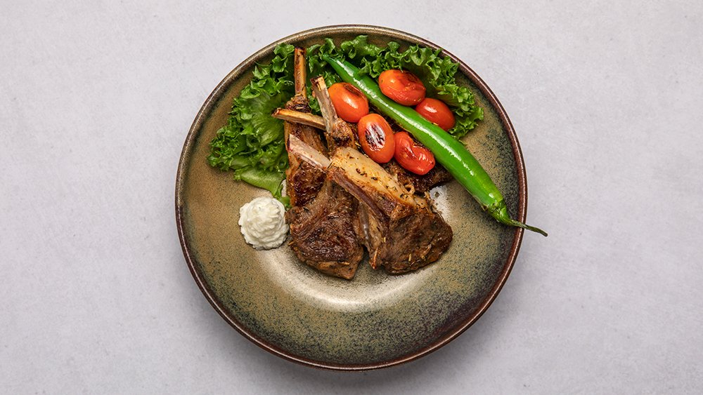 Lamb racks med sallad, jackpotatis och vitlökskräm.