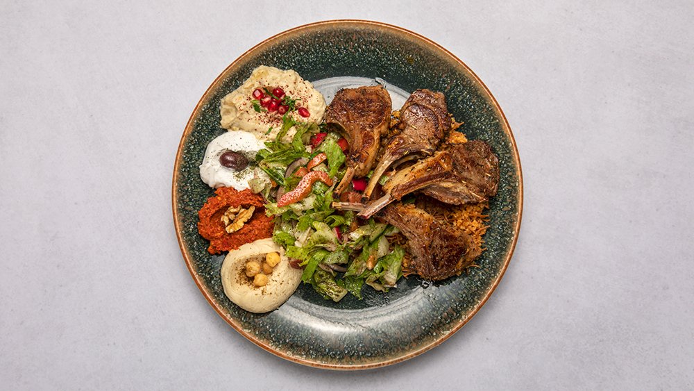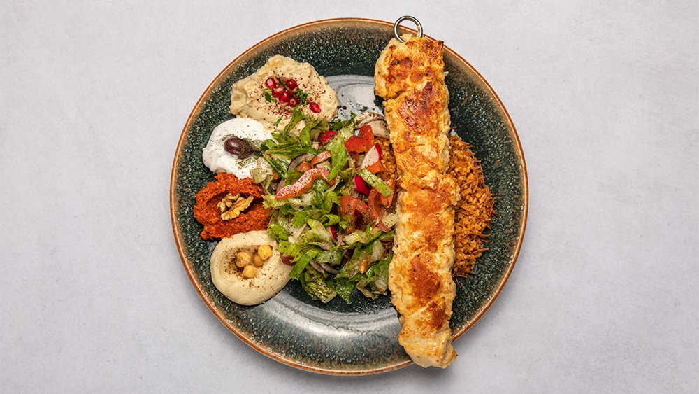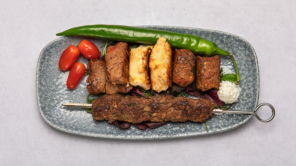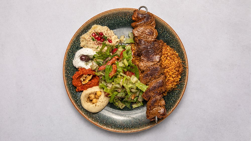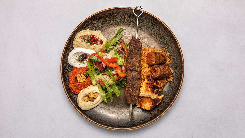 Lammfilé, kycklingfilé och oxspett. Serveras med bulgur, sallad och fyra libanesiska mixar.