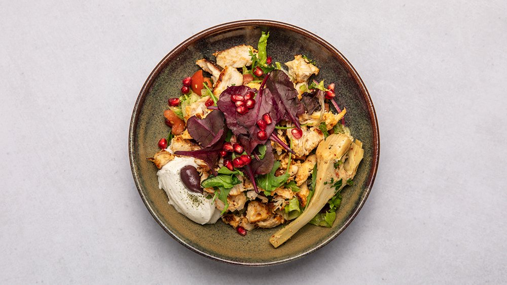 Bladsallad med fårost och chili toppad med granatäpplen.