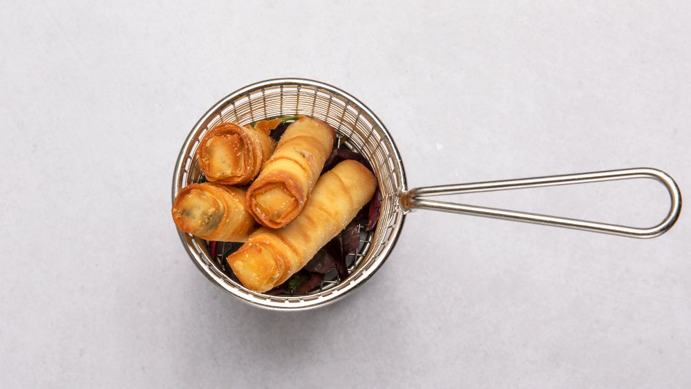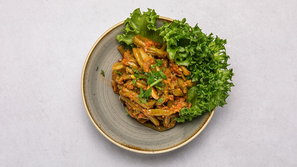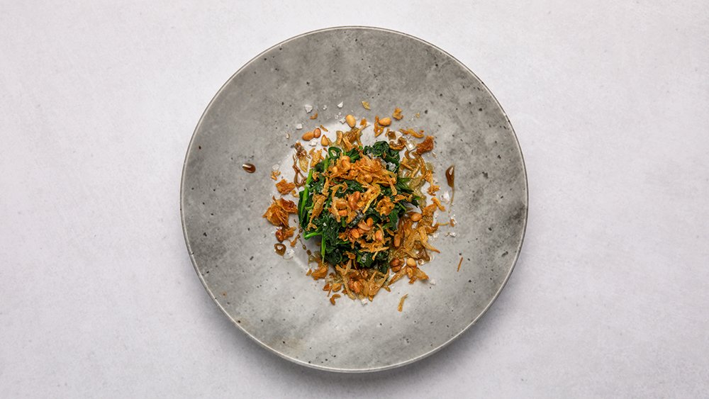 Fräst spenat med pinjenötter toppad med rostad lök.