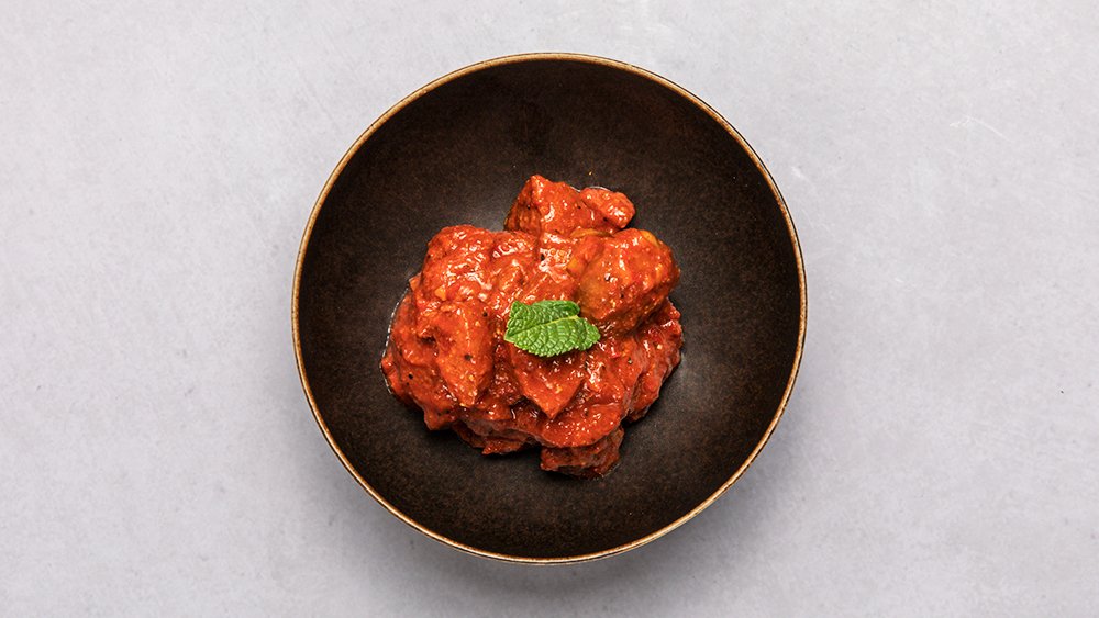 Kompott av stekt lök och vildsvamp toppad med granatäppelsirap.