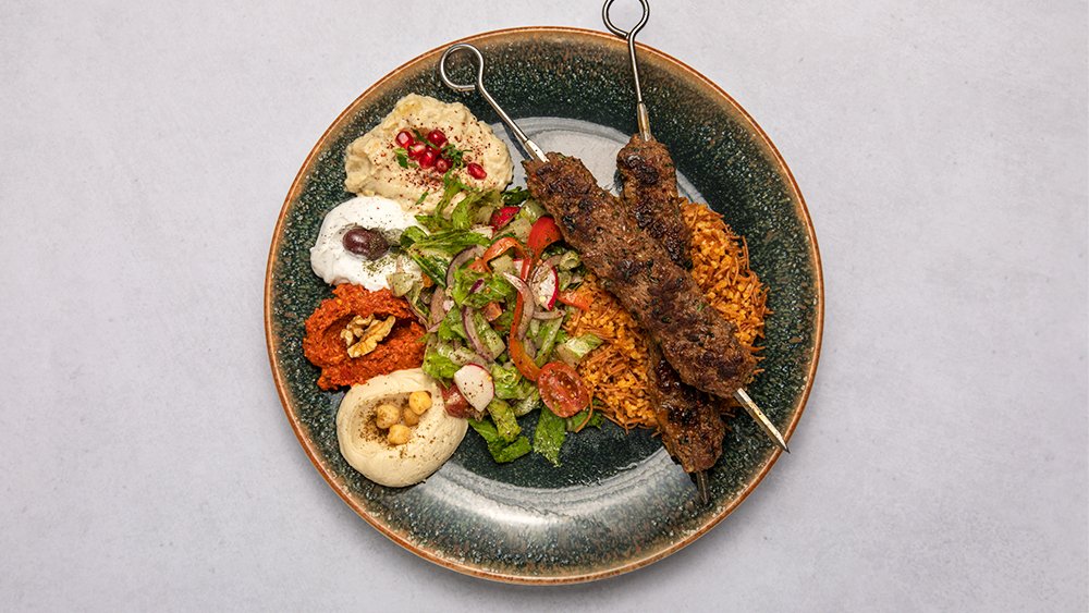Marinerade nötköttsspett serveras med bulgur, sallad och fyra libanesiska mixar.