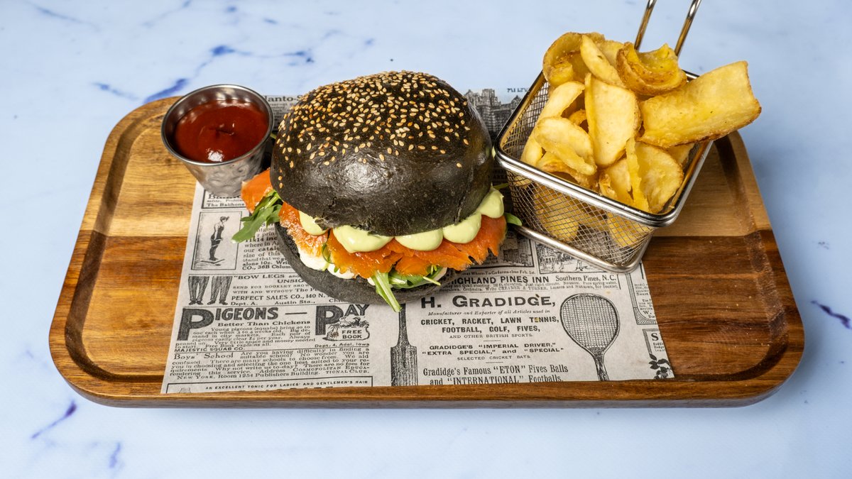 Brioche charcoal bun filled with smoked salmon, rucola, lemon-infused cream cheese and herb aioli