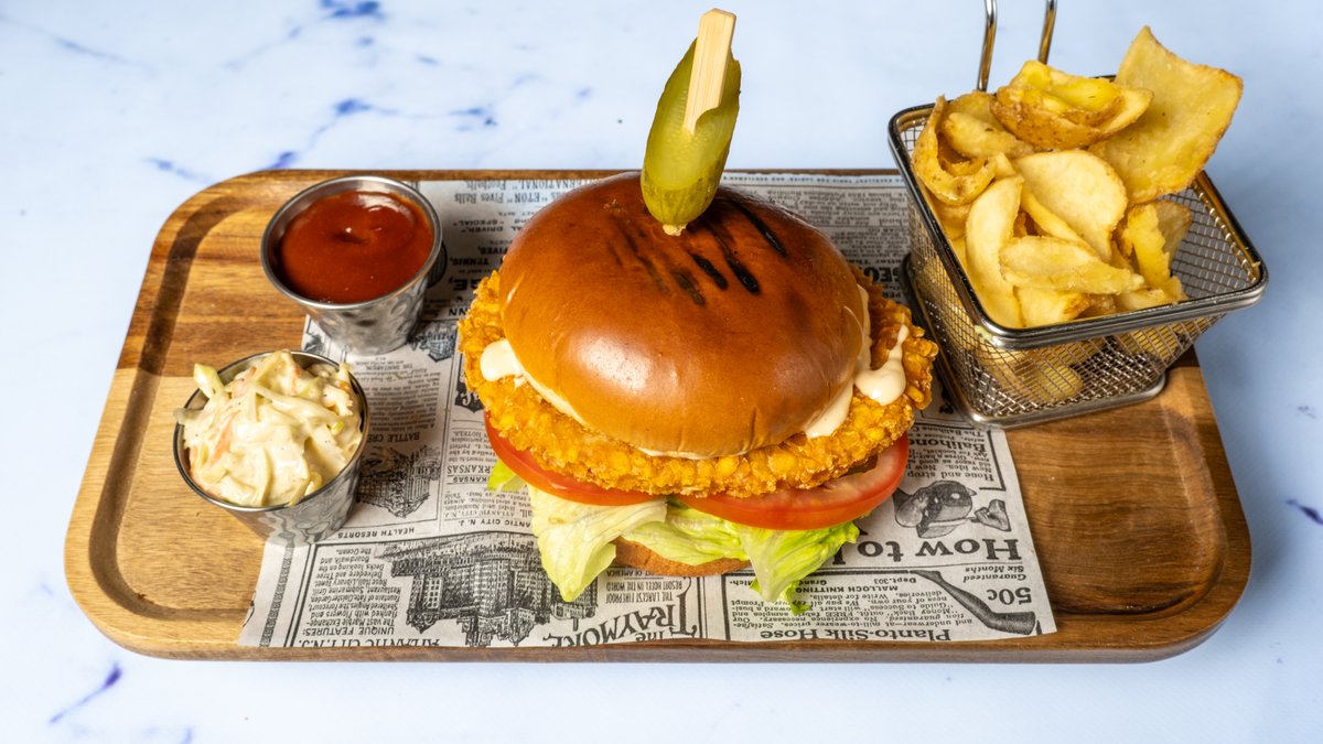 Crispy chicken burger with sriracha mayonnaise, lettuce and tomato