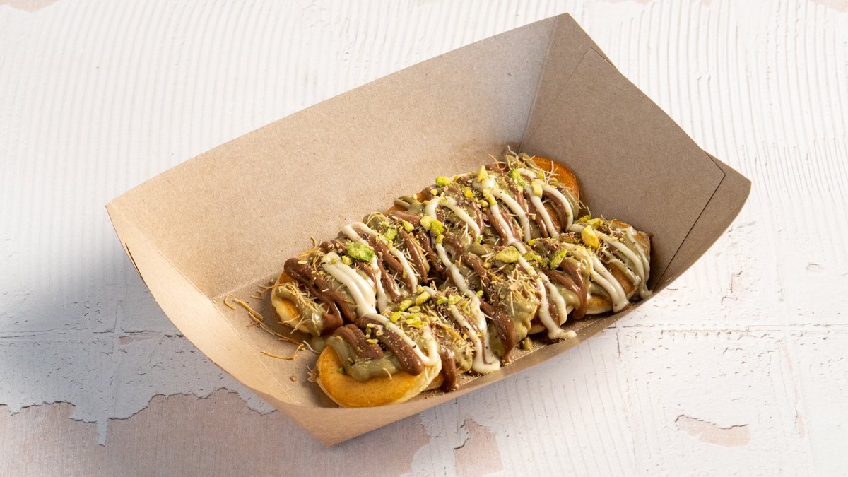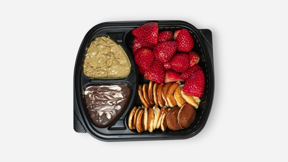 Platter with 20 mini pancakes and fresh strawberries, served with pistachio spread with crispy kadaifi, Nutella & white chocolate on the side.
