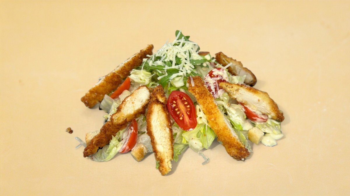 Iceberg lettuce, cherry tomato, crispy chicken, Parmesan cheese, croutons, and Caesar dressing