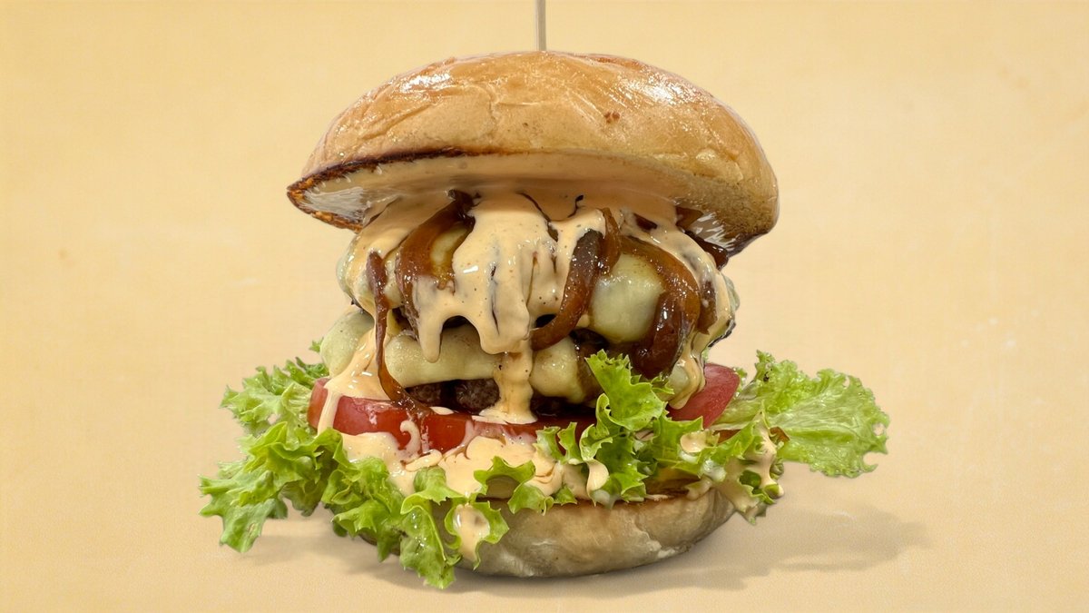 Beef patty 150 g, green salad, tomato, caramelized onions, egg, bacon, cheese, Burger Station sauce