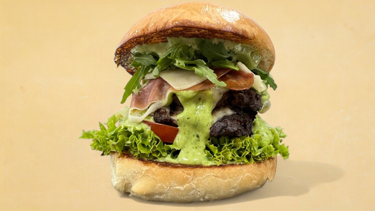Beef patty 150 g, pesto aioli sauce, green salad, sun-dried tomato, prosciutto slice, mozzarella cheese, fresh rucola