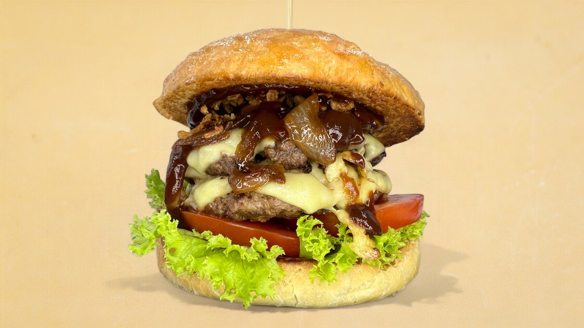 Beef patty 150 g, salad, tomato, caramelized onion, crispy fried onion, cheese, BBQ sauce
