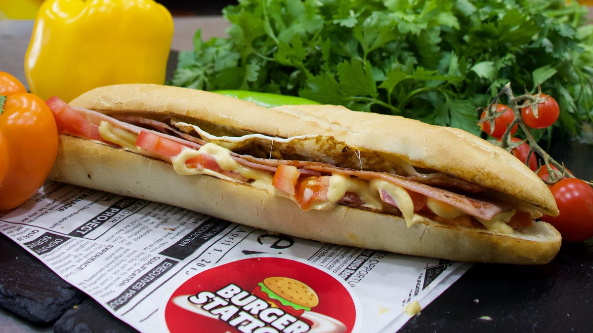 Beef patty 150 g, green salad, fresh tomato slice, Burger Station sauce, caramelized onion, cheese