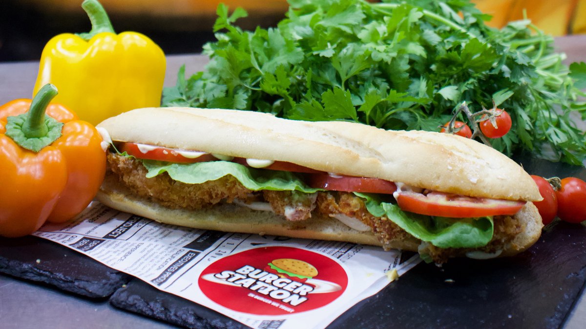 Beef patty 150 g, green salad, fresh tomato slice, Burger Station sauce, caramelized onion
