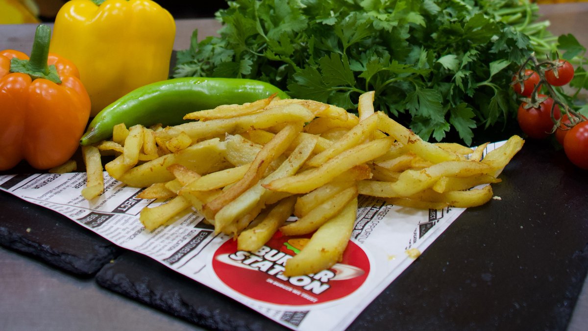 150g. Green salad, fresh tomato slice, burger station sauce, caramelized onion. Served with fries and a soft drink