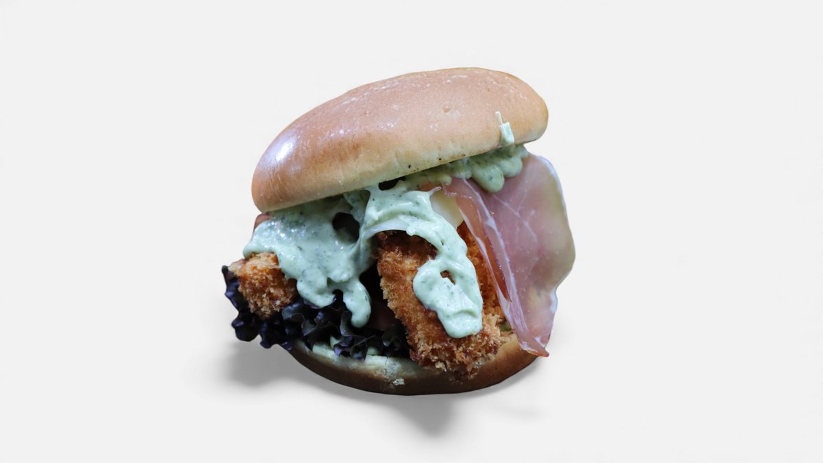 Chicken patty 150 g, pesto aioli sauce, green salad, tomato, prosciutto slice, mozzarella cheese, fresh rucola