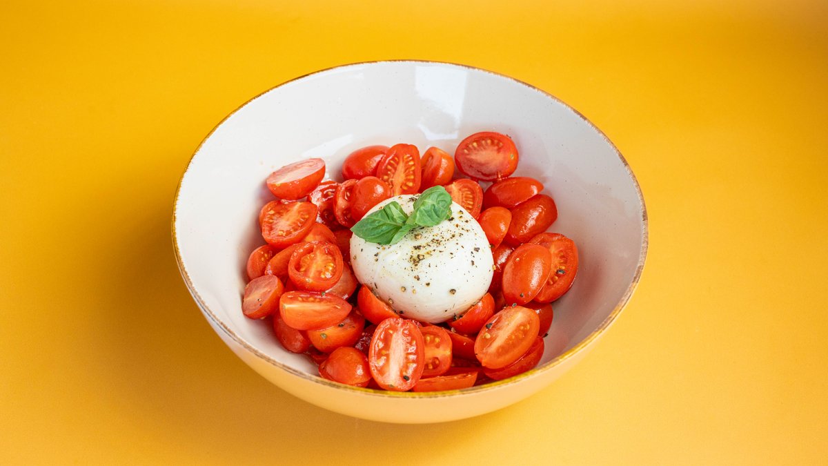 Shrimps, cherry tomatoes, fresh basil, olive oil and lemon juice