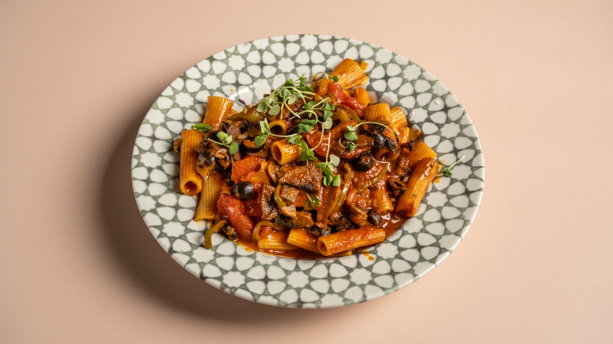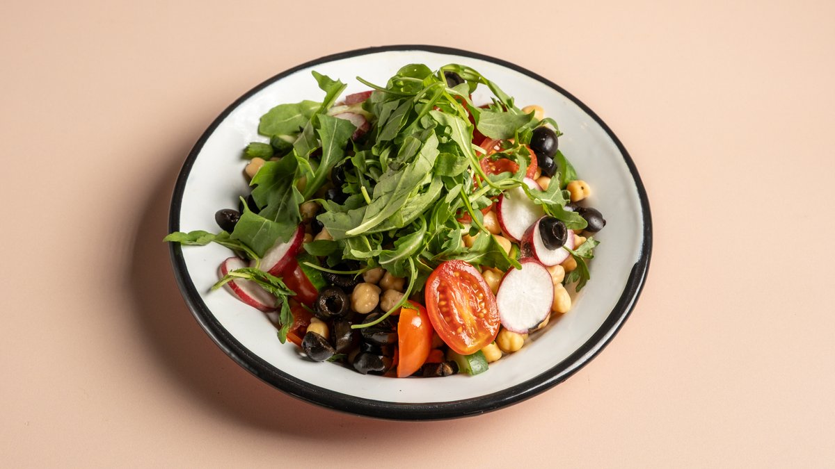Olives, cherry tomatoes, cucumber, radish, rocket, parsley and olive oil and lemon sauce