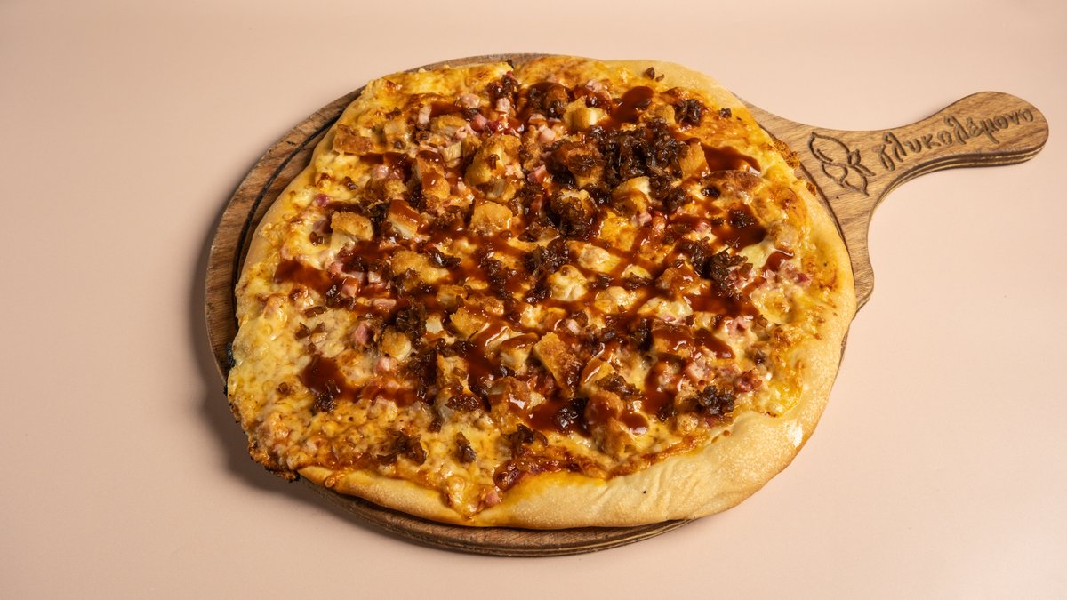 Edam cheese, fried breaded chicken, bacon, bbq sauce, caramelized onions