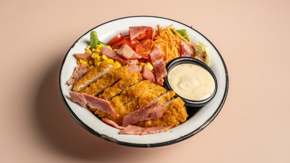 Mixed salad with shredded carrots, sweet corn, cherry tomatoes, bacon and freshly fried chicken breast served with honey mustard dressing