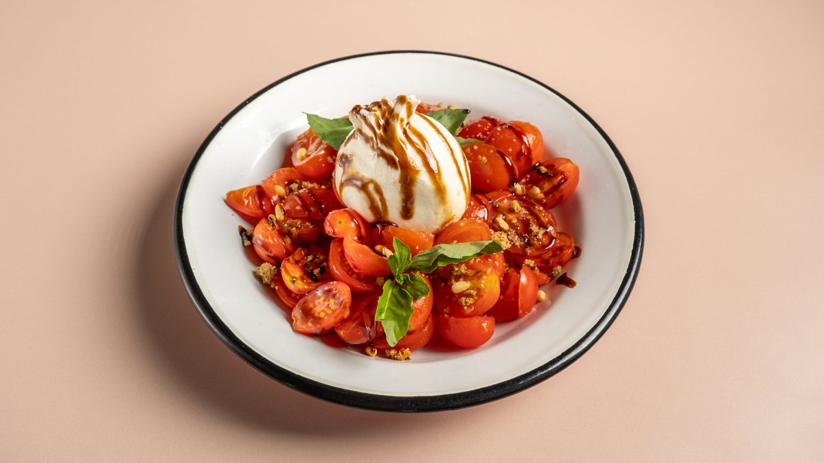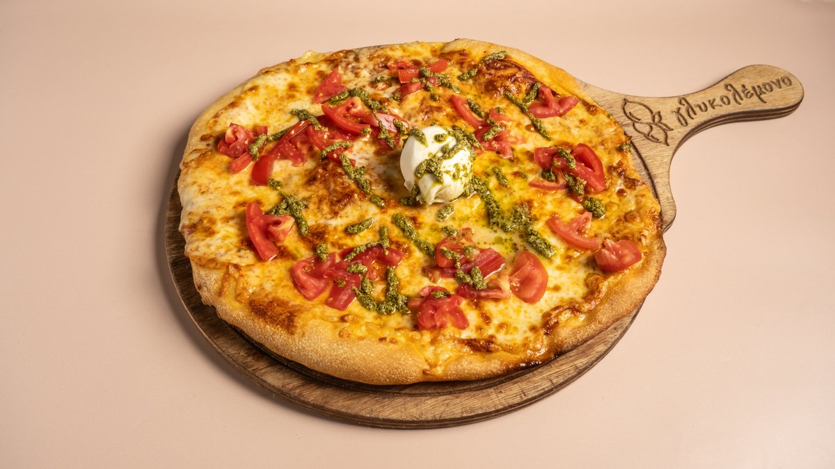 Mozzarella, cherry tomatoes, fresh burrata, basil pesto