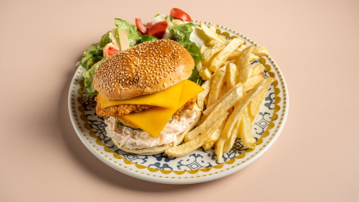 Fried chicken in a brioche bun with coleslaw, cheddar cheese and lettuce. Served with french fries