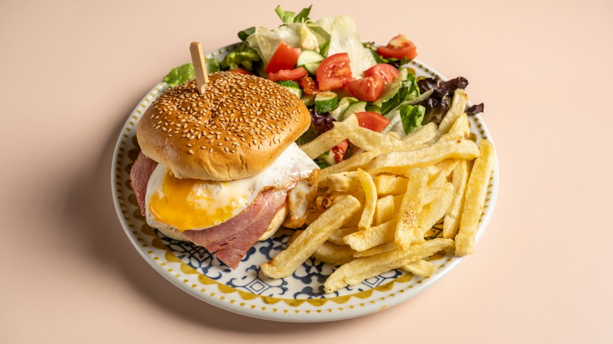 Mayonnaise, bacon, fried egg, tomato and cheddar cheese in a brioche bun. Served with french fries