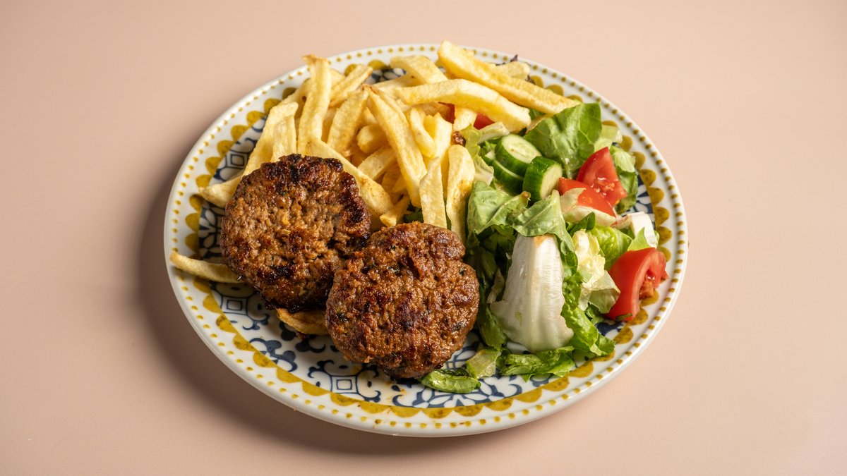 2 Homemade 140g pork and beef burgers, salad, fresh fried fries or rice