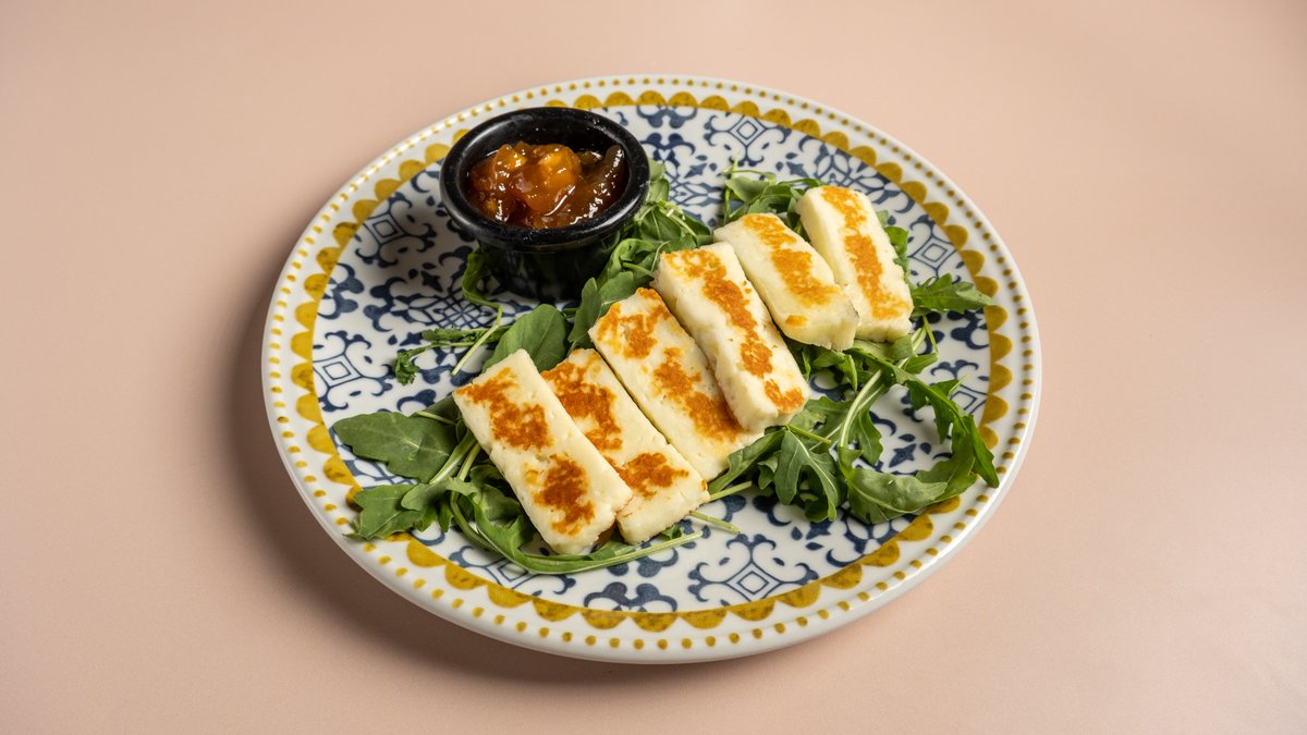 Halloumi on the grill served with fig chutney with freshly baked bread with pesto, rocket