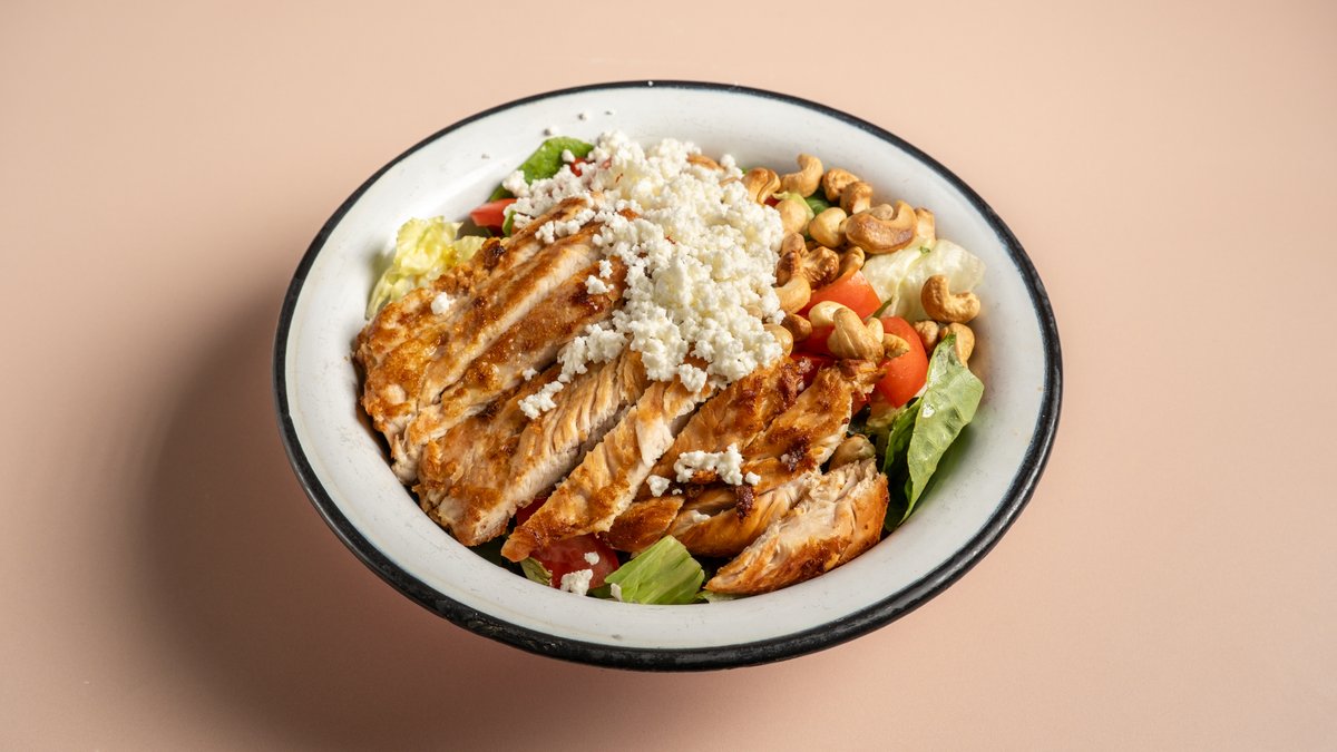 Mixed salad, grilled chicken, cashew nuts, feta, tomato, and our homemade signature balsamic-honey dressing
