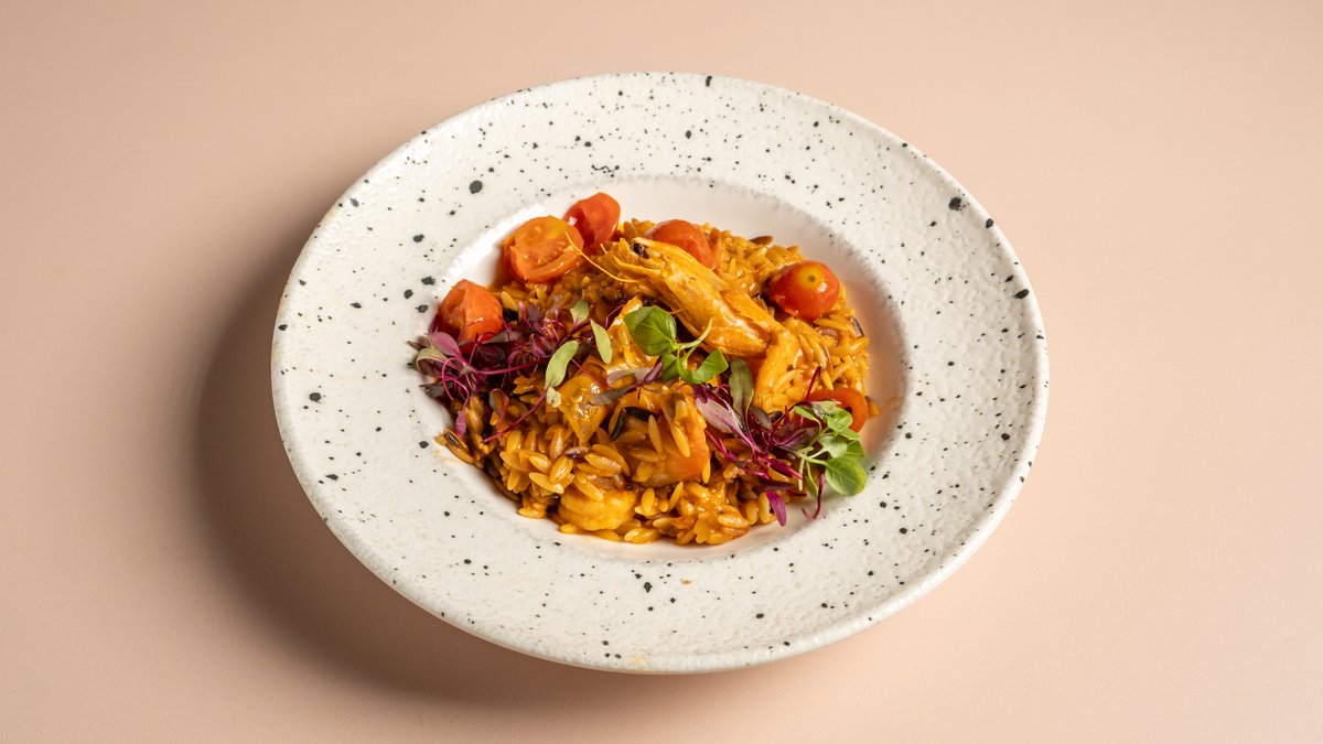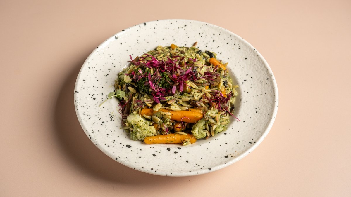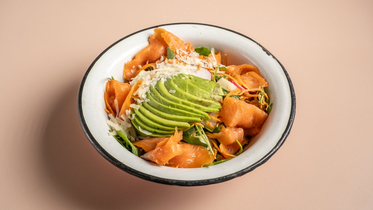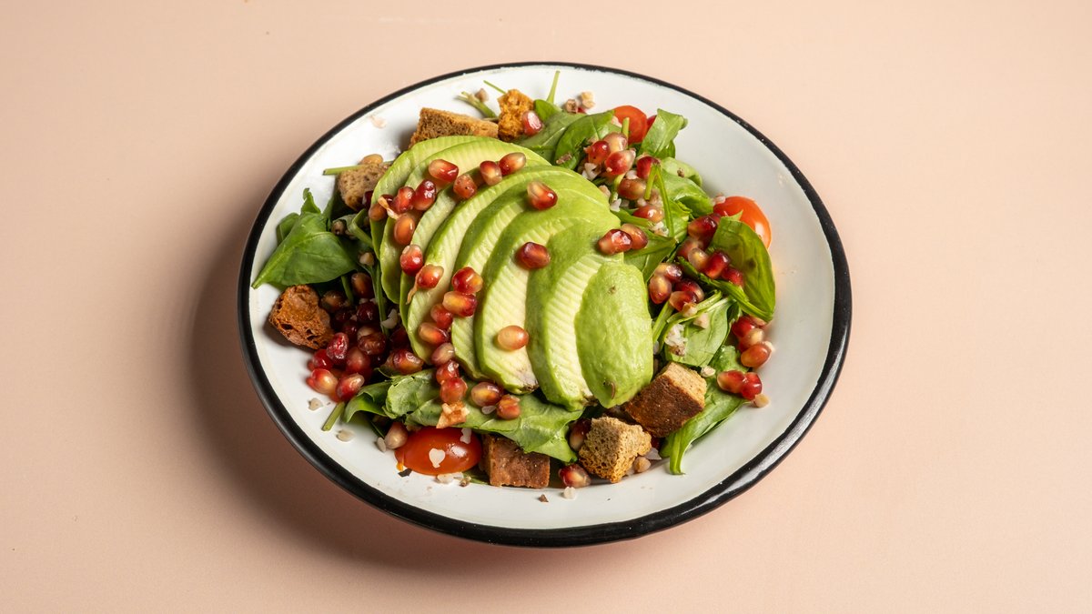 Baby spinach, buckwheat, avocado, cherry tomatoes, pomegranate, croutons and yogurt sauce with herbs