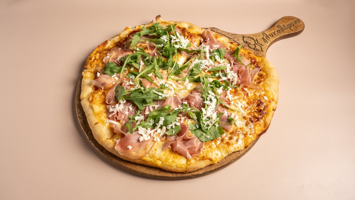 Mozzarella, prosciutto, rocket leaves, parmesan, tomato sauce