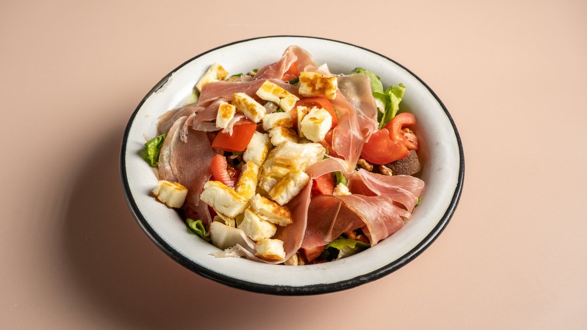 Mixed salad, walnuts, dried figs, tomato, croutons, halloumi, prosciutto, balsamic and honey sauce on the side