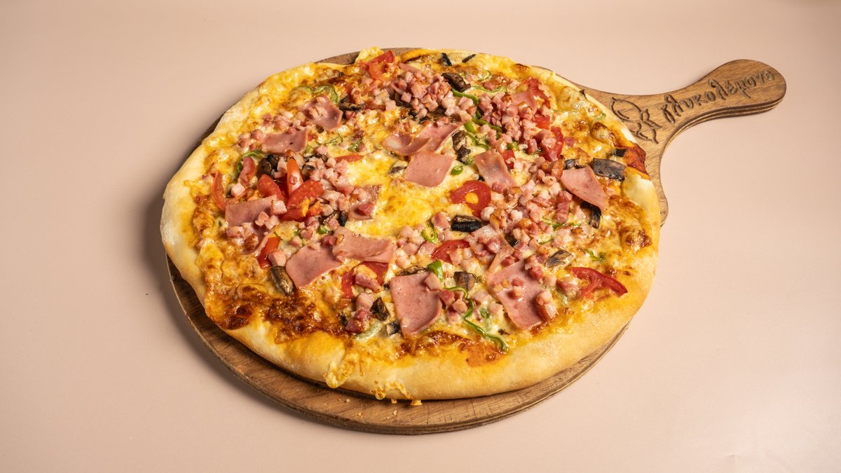 Tomato, cheese, bacon, ham, mushroom, peppers, tomato sauce