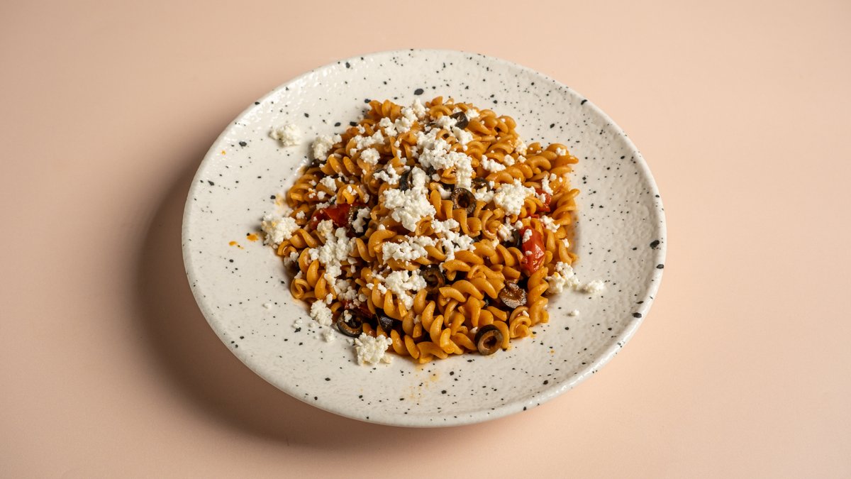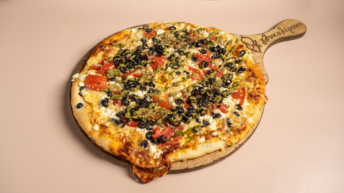 Edam cheese, feta cheese, tomato, olives, onion, oregano and basil pesto