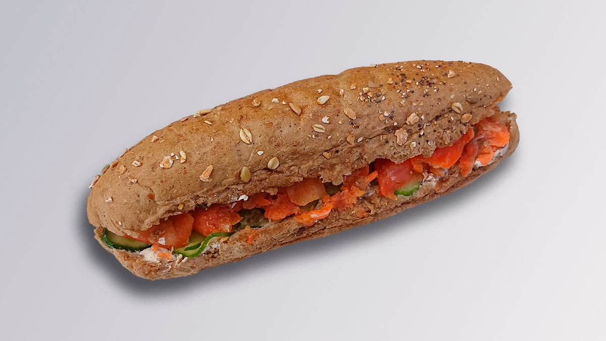 Wholewheat loaf with smoked salmon, cream cheese, capers and cucumber.