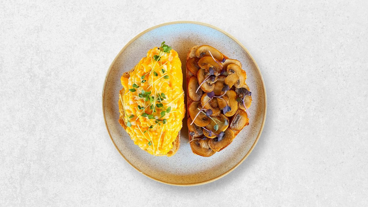 Scrambled eggs, sauteed mushrooms, served on sourdough toast bread