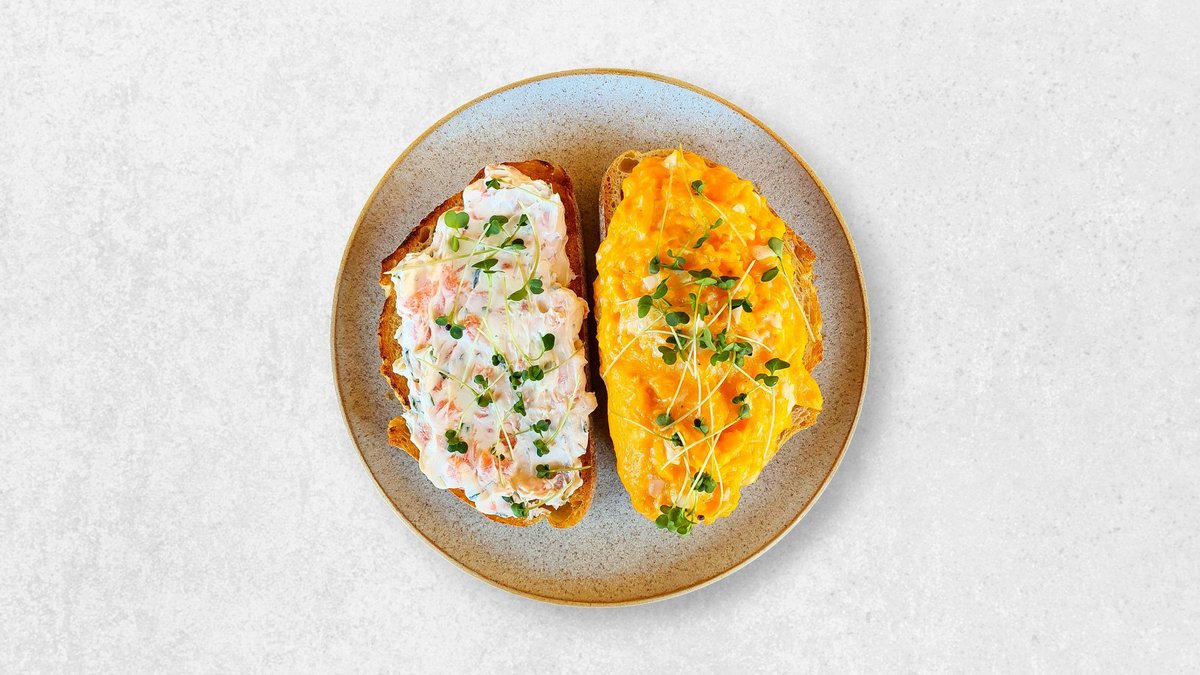 Scrambled eggs, cream cheese spread with smoked salmon and herbs, served on sourdough toast bread